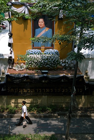 Phra Chaoyuhua Bhumibol Adulyadej, el Grandioso, es el rey mundial que más años lleva en el cargo, y por lo que parece también es uno de los que más admiraciones despierta entre sus súbditos. A ojos de los tailandeses es a partes iguales un santo y un super-héroe, y no hay casa, tienda o calle que no tenga por lo menos una foto suya. En realidad toda la familia real recibe veneración casi divina, y ahora que acaba de morir la hermana del rey todo el país está de luto y millones de tailandeses acuden a los templos a mostrar sus respetos. En las tiendas de recuerdos venden todo tipo de fotos y estampitas del regente, incluidas las de su etapa de monje y de estudiantes gafotas. No sabemos muy bien si el señor se merece tanto respeto, pero lo cierto es que hace unos meses hubo un golpe de estado para echar a un gobierno corrupto y aquí parece que nadie pestañeó porque el rey seguía estando ahí, y en nada volvieron a organizar elecciones. También nos han contado que la reina es famosa porque ayuda personalmente a los más necesitados, como en los cuentos de hadas. El respeto por la casa real es tan grande que la ley prohibe expresamente pisar los billetes para no mancillar la imagen del rey que aparece en ellos. En los billetes, por cierto, suele aparecer con una cámara de fotos de la que no se separa nunca. La publicidad que le ha hecho a Canon no debe tener precio...
